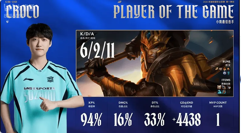 虎扑01月16日讯 在刚刚结束的LNG对阵OMG首局比赛中,Croco皇子打出6/2/11战绩,拿到首局比赛MVP