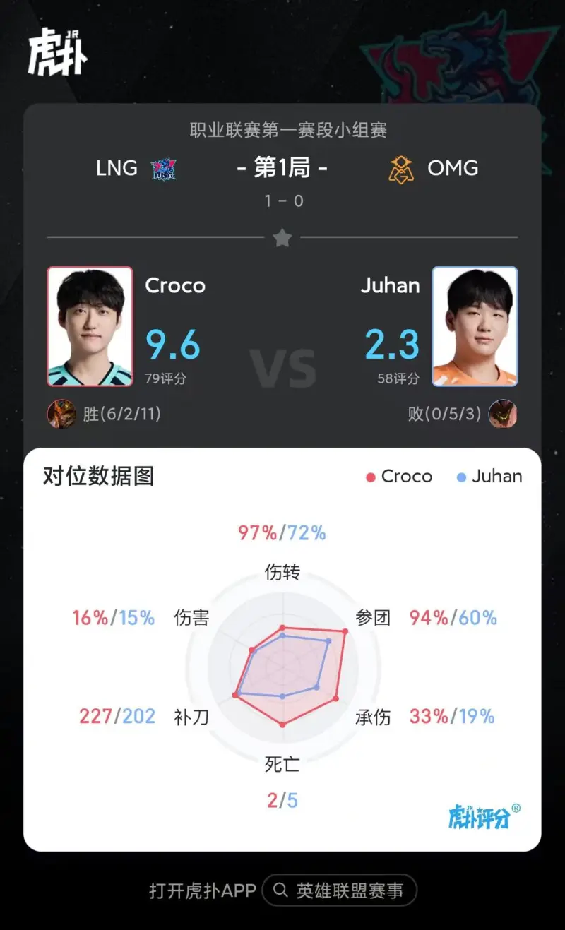虎扑01月16日讯 在刚刚结束的LNG对阵OMG首局比赛中,Croco皇子打出6/2/11战绩,拿到首局比赛MVP前往LOL专区发帖讨论,与客观、有趣、懂赛事的JRs共议本场比赛>来源:虎扑 虎扑01月16日讯 在刚刚结束的LNG对阵OMG首局比赛中,Croco皇子打出6/2/...