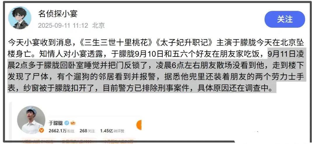 可于朦胧这件事,细节上都透着蹊跷。突然有多名网友爆料于朦胧跳楼身亡,狗仔写道出演过《三生三世十里桃花》且粉丝超过2000万的男演员、在北京坠楼身亡。