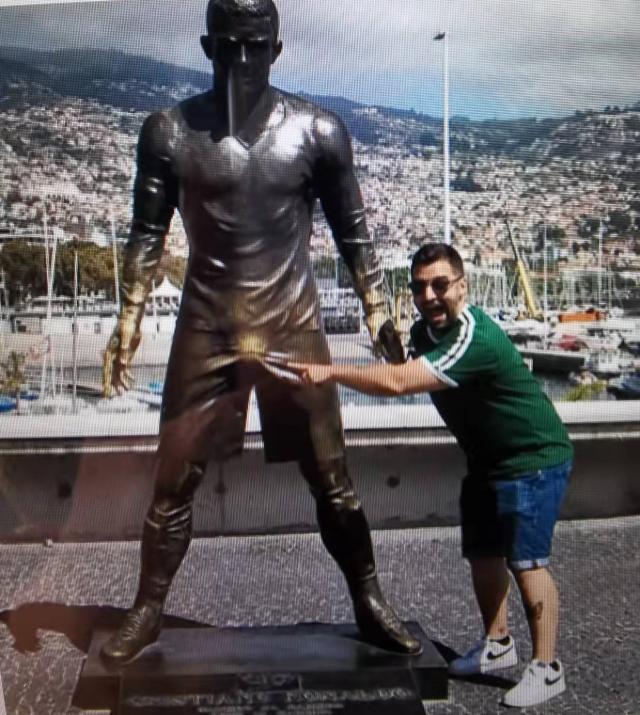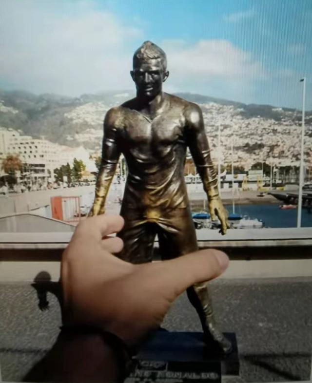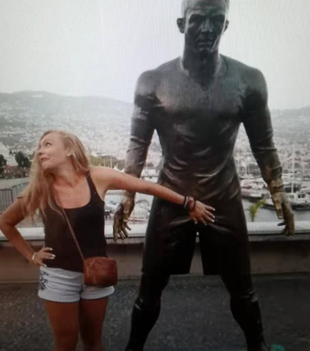 当年C罗铜像揭幕时,全身是一个颜色。可不管谁到了C罗像前,肯定得合个影,以证明曾到此一游。合影的时候,难免有人动手动脚,乱摸乱碰。于是C罗铜像的有些部位就被摸得亮亮的,裆部是一个,另外还有双手。
