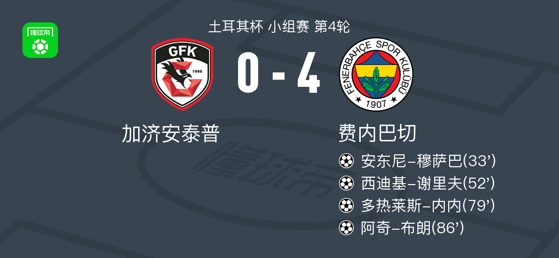 北京时间3月5日土耳其杯 小组赛 第4轮,加济安泰普对阵费内巴切。费内巴切安东尼-穆萨巴破门,西迪基-谢里夫破门,多热莱斯-内内破门,阿奇-布朗破门。最终比分加济安泰普 0-4 费内巴切。