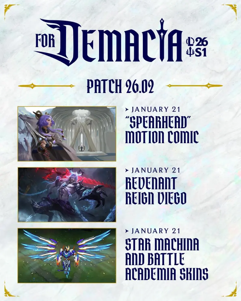 虎扑01月09日讯 LOL发布德玛西亚赛季版本规划(具体上线内容请以正式服为准),具体如下:26.01版本:全新版本上线“德玛西亚的崛起”小游戏上线德玛西亚主题皮肤上线26.02版本:“芸阿娜归还赵信长矛”主题漫画上线复仇君王-佛耶戈上线神盾机甲主题皮肤上线26.03版本:无限火力轮换模式...